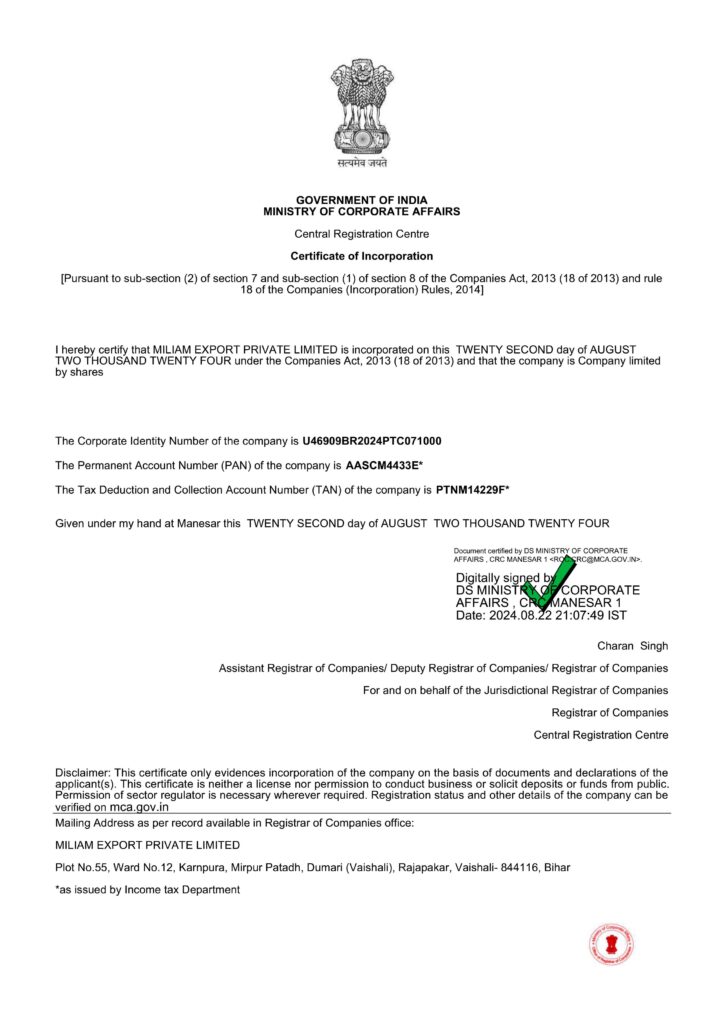 Miliam Export Pvt. Ltd. is certified by the Government of India, adhering to all required standards and regulations. Our certification ensures that we meet the highest quality and safety criteria, making us eligible to supply our products across the globe. Trust in our certified excellence and let us be your reliable partner for all your agricultural product needs.