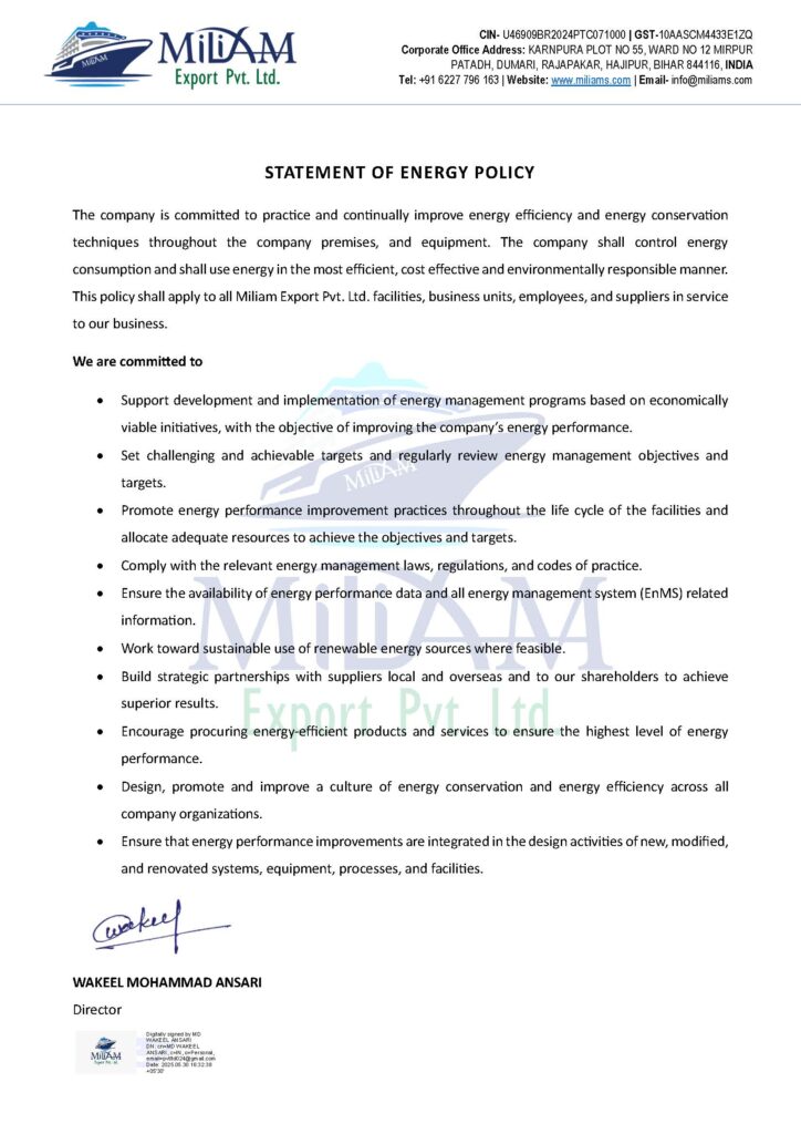 Founded by Jainul Nisha, Miliam Export Pvt. Ltd. stands as a beacon of excellence in the export industry, rooted in the vibrant state of Bihar, India. We pride ourselves on being a leading exporter of a diverse range of high-quality products, including agro products, marine products, industrial goods, automobile spare parts, medical products, and HVAC solutions. Our strategic location and deep understanding of both local and international markets enable us to cater to the unique needs of our clients, ensuring timely delivery and unparalleled service.